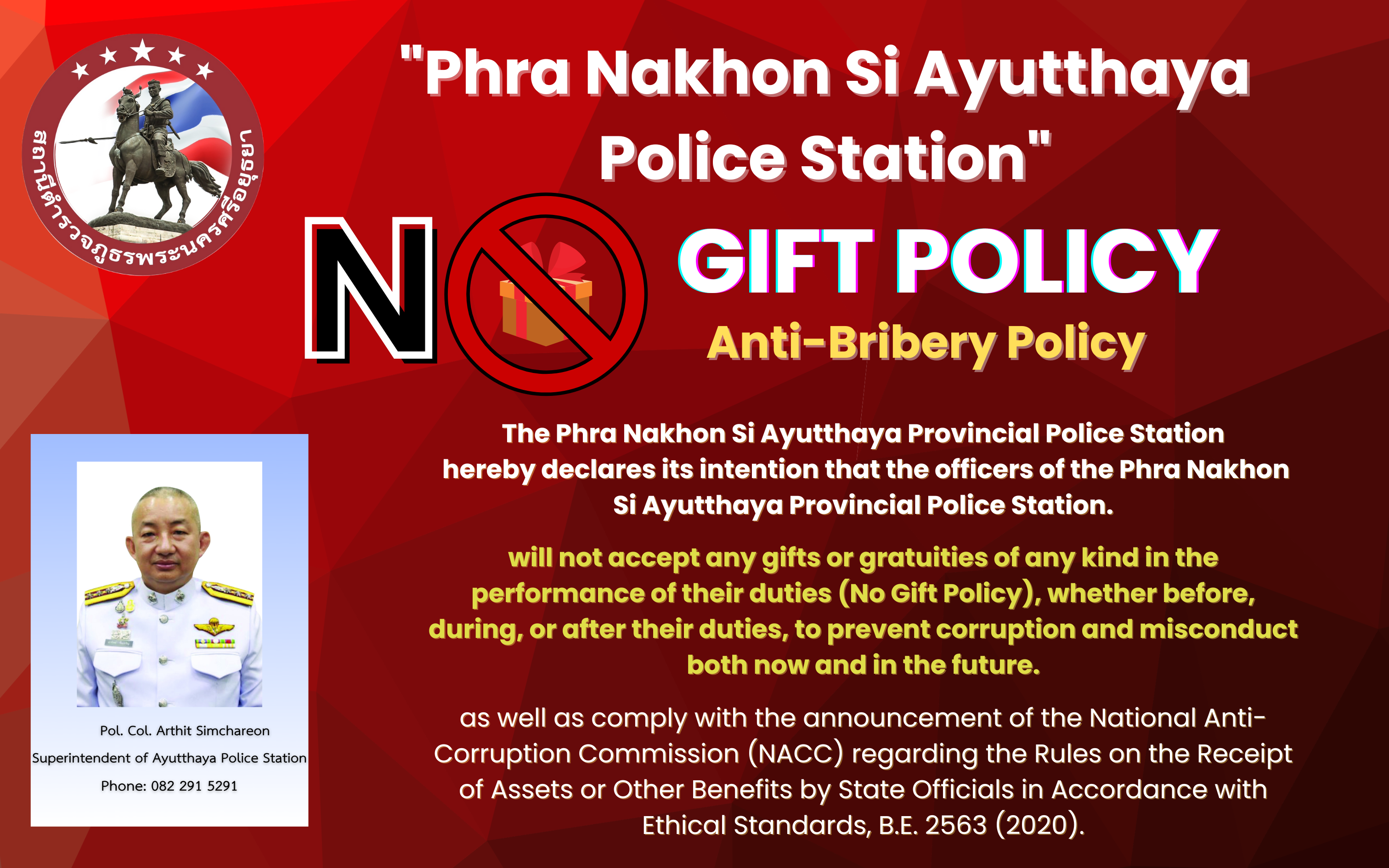 ประกาศเจตนารมณ์ที่จะไม่รับของขวัญหรือของกำนัลทุกชนิดจากการปฏิบัติหน้าที่ ( No Gilf Policy )